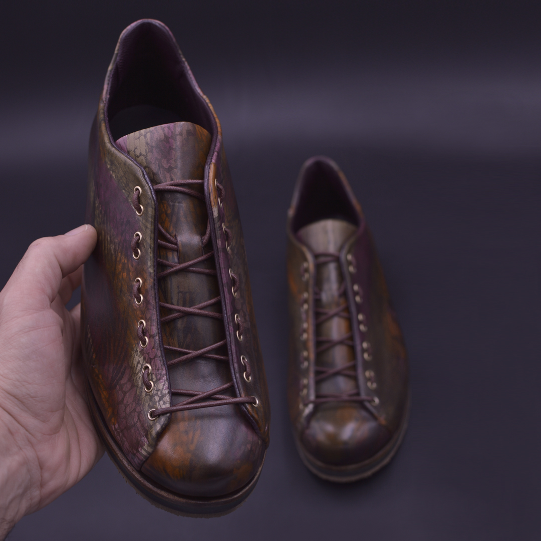 An ethical shoe because it respects the work in every phase, A sustainable solidarity purchase is created together with the customer, because nothing is produced that is not required only on order. A product customized in every detail, starting with the materials chosen of the highest quality, up to providing a full Bespoke service. Everything is made with craft workmanship to last over time and not to be replaced, but reused. The environment as an objective to preserve, so colors and treatments change towards an increasingly natural product, built with natural glues and in recycled cardboard boxes. An experience that is followed from start to finish by a constant customer service, even in the care of the shoe during his life. With the customer we look for the solution that satisfies as much as possible the request and needs: